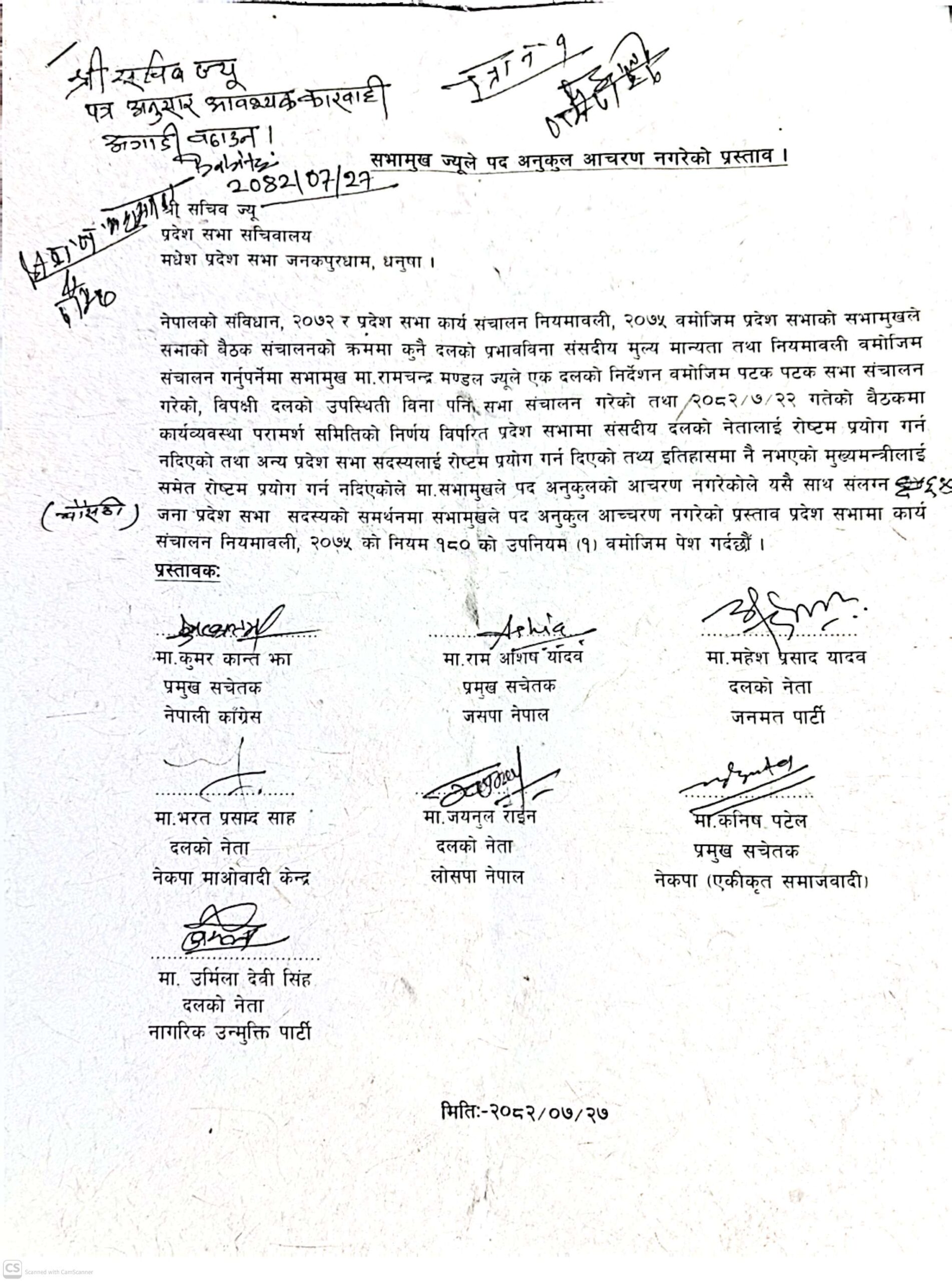 मधेश प्रदेशका सभामुख रामचन्द्र मण्डल माथि महाभियोग दर्ता