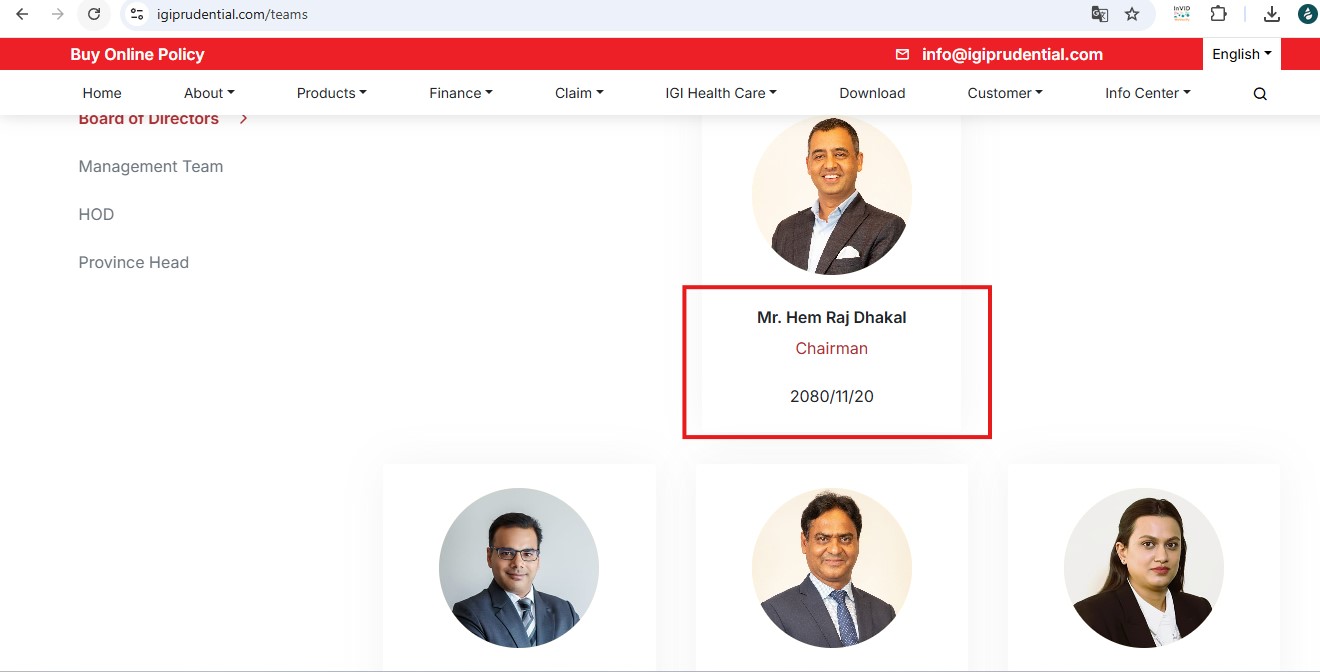 यो ईन्स्योरेस्न कम्पनीको अध्यक्ष हेमराज ढकाल रहेका छन् । हेमराज ढकाल व्यवसायी चन्द्र ढकालका आफ्नै भाई हुन् । ढकालले समेत गैरआवासीय नेपाली भएपनि नेपालमा इन्स्योरेन्स कम्पनीको नेतृत्व गरिरहेको बताईन्छ ।